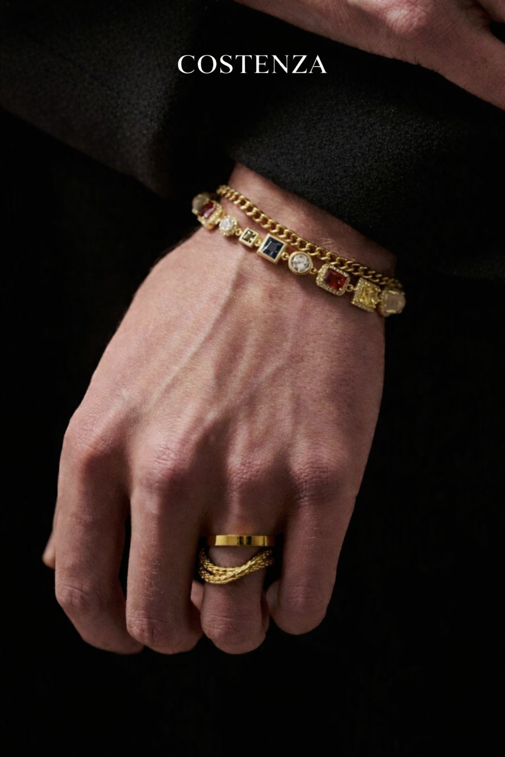 Designed to make a refined statement, this gold-tone bracelet is crafted with a bold chain silhouette accented by multicolour gemstone details. Each stone is carefully set to add depth, contrast, and a distinctive character, balancing elegance with modern edge.